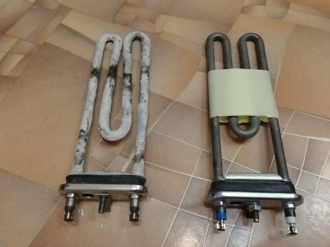 - Износ деталей обуславливается сроком службы машин, через 1-2 года ТЭН покрывается накипью, подшипники и сальники, электрощетки в процессе работы разрушаются. Заметить можно по сильному стуку стиральной машины. Мы проводим бесплатную диагностику, после нее candy ремонт стиральных машин наверняка решит проблему. На фото видна четкая разница между ТЭНом, который покрылся накипью, и совсем новым.